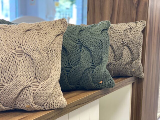 Almofada rústica, super elegante, com a frente toda em tricot artesanal.