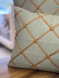 Almofada com recortes em couro sintético, super elegante, para complementar a decoração do seu ambiente.