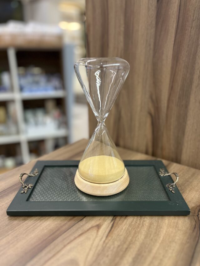 Ampulheta com base de madeira que mede o tempo e decora.