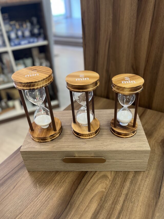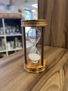 Ampulheta com bases em madeira que medem o tempo e decoram.