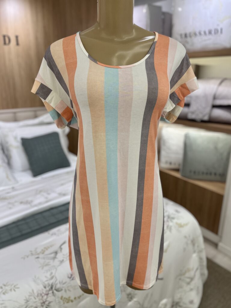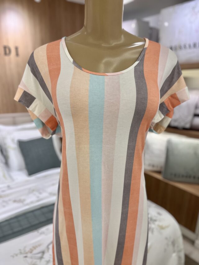 Camisão em viscose, com toque muito macio e fresquinho.  Possui modelagem ampla e listras vibrantes, é ideal para quem busca conforto. É curto, leve, tem manga curta e decote arredondado.