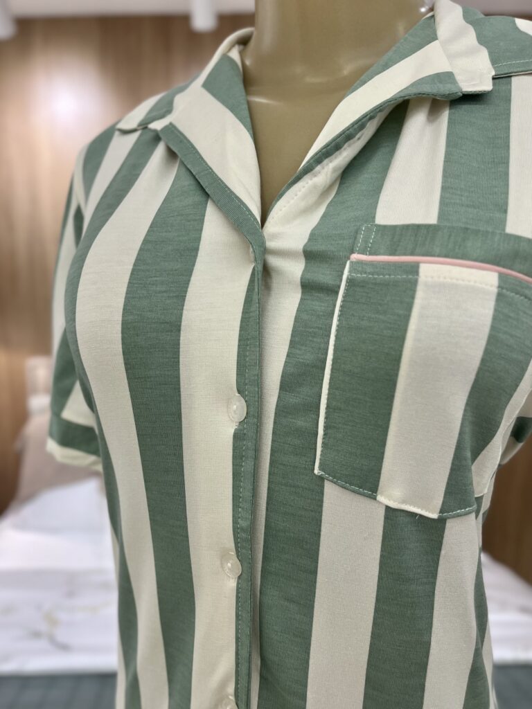 Pijama feminino em viscose, com toque confortável e fresco. Traz leveza e modelagem ampla e caimento suave, perfeito para relaxar com conforto e estilo. O camisão é curto, possui botões frontais, manga curta, gola esporte, bolso no busto e listras verdes.