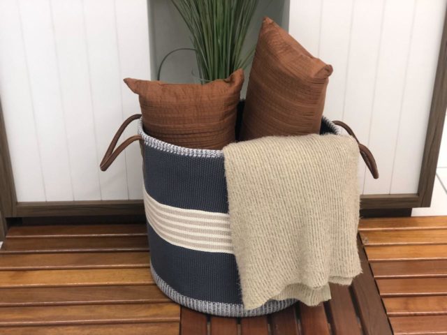 Cesto de tricot 100% algodão de fio tinto, com alças em couro, dando um toque diferenciado. Além de decorar, traz aconchego e personalidade ao ambiente. Muito útil para guardar objetos, organizar ou até mesmo para colocar plantas.