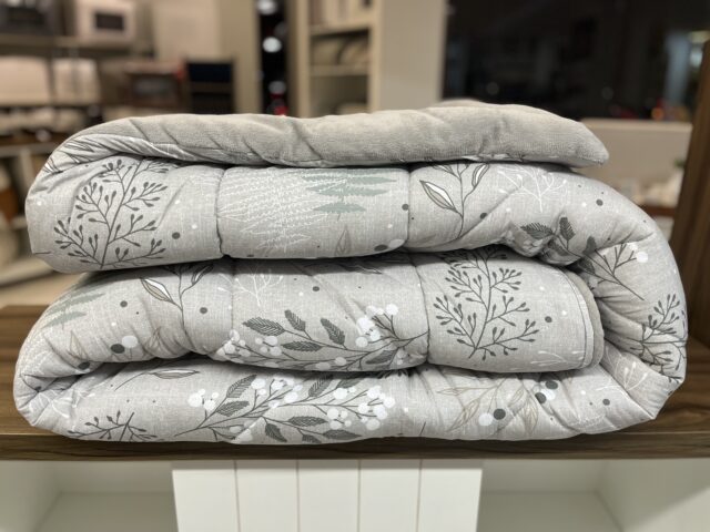 Edredom em malha e plush. Inspirado na tranquilidade da natureza, o edredom Serenity traz uma estampa suave com folhas delicadas em tons de cinza e verde-menta sobre um fundo claro. Ideal para ambientes minimalistas, transmite calma e equilíbrio. Sua superfície em malha fio penteado 100% algodão garante maciez ao toque, enquanto o verso em plush oferece o aconchego ideal para noites de frio moderado. Foi cuidadosamente desenvolvida para acompanhar os invernos cada vez mais amenos, oferecendo o equilíbrio perfeito entre leveza e aconchego. Com uma seleção especial de novas estampas e tecidos macios, cada peça transmite autenticidade e bem-estar. Pensada para proporcionar conforto térmico em temperaturas moderadas, a coleção combina a suavidade natural da malha fio penteado 100% algodão com a maciez do plush premium no verso.