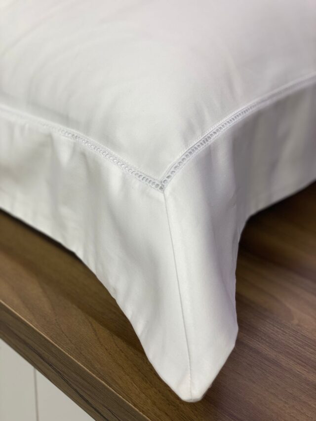 Fronha em 400 fios, algodão egípcio, com bordado ajour em toda a aba. Ela tem um toque acetinado, macio, com um leve brilho.