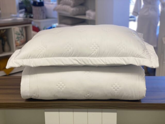 Jogo de colcha em microfibra, com toque macio e aconchegante. Uma peça clássica, que fica bem elegante na cama. Possui acabamento micromatelassado, sem costura, em forma de cruzinhas, o que traz um ar bem contemporâneo à peça.