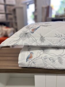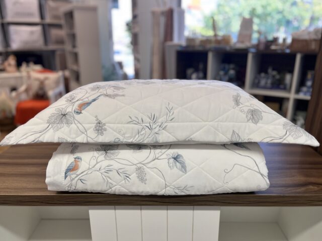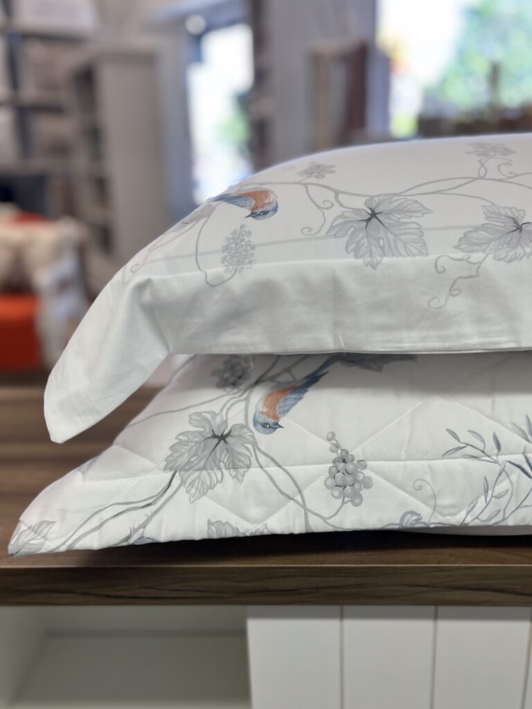 Jogo de colcha em 300 fios, 100% algodão egípcio. Inspirado nas belas paisagens dos vinhedos, sua colcha e porta-travesseiro dupla face apresentam uma estampa com uvas, parreiras e pássaros que enriquecem a composição e trazem sofisticação para o quarto. O verso traz uma estampa de linhas assimétricas em tons claros, que compõem com harmonia. Com um caimento perfeito e tratamento termobond, que evita deformações e garante maior durabilidade à peça, Videira é a cama que leva para uma verdadeira viagem aos vinhedos.