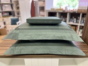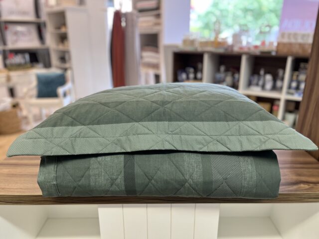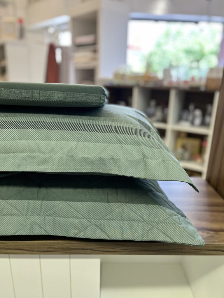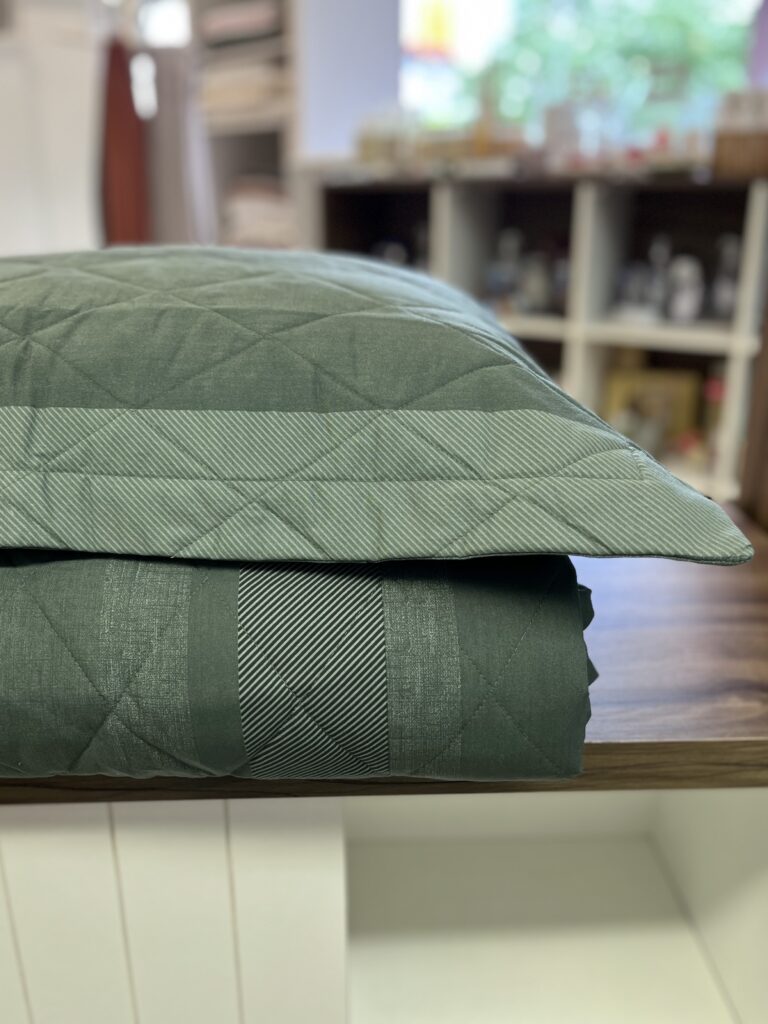 Jogo de colcha em percal 200 fios, 100% algodão. Com identidade visual marcante e contemporâneo, Ícaro aposta em listras e tons de verde profundos que deixam a decoração do quarto com ainda mais personalidade. A colcha é dupla face, com padrões geométricos coordenados que permitem variar a composição. Os dois porta-travesseiros acompanham o visual gráfico da linha, reforçando a estética mais moderna e sóbria. Com acabamento matelassado e tecido 200 fios em algodão puro, une conforto e estilo.