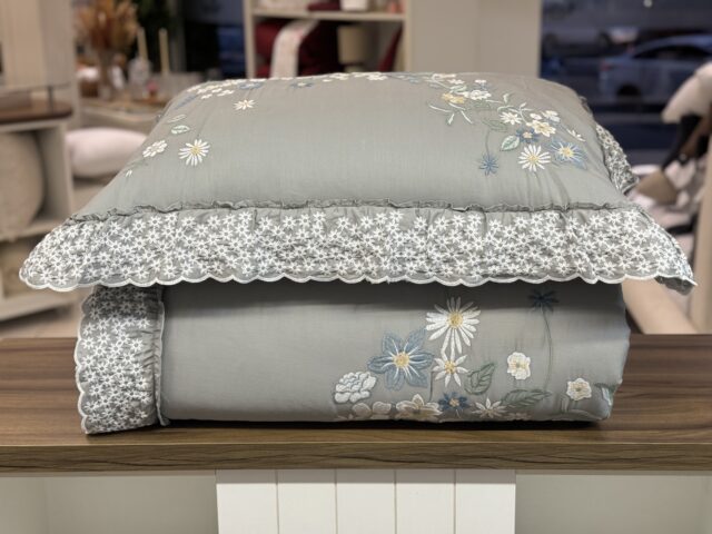 Jog de colcha em cetim, 100% algodão, com o toque extremamente macio e aconchegante. Moderna, elegante e inspiradora, a Colcha Le Corsaire conduz a um suave cenário natural, com belíssimos bordados florais do campo. A base em cinza oliva combinada com delicados ornamentos em tons azuis, cria sofisticada atmosfera que convida a uma relaxante imersão aos sentidos. E os babados laterais enobrecem ainda mais o modelo, conferindo charme e refinamento. Seu toque acetinado em puro algodão é extremamente macio, incrivelmente acolhedor e muito aconchegante de sentir.