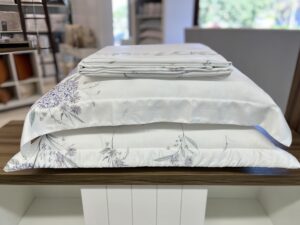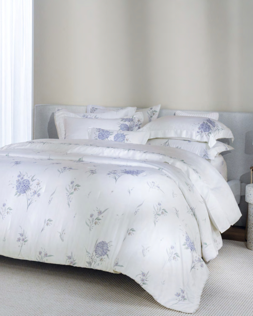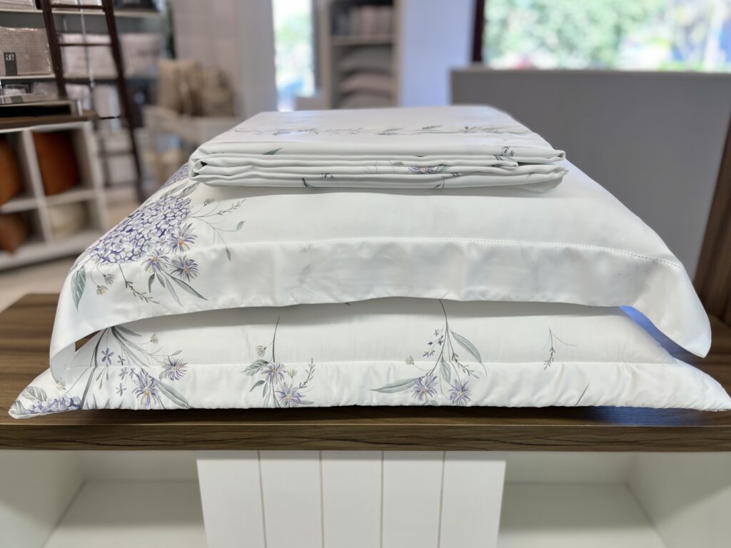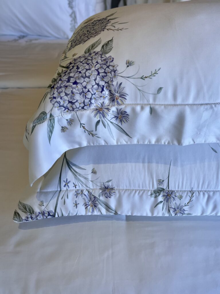 Jogo de colcha em bambu 300 fios. O brilho do bambu agora recebe as hortênsias encontradas sob os vasos das charmosas vielas sicilianas. As flores únicas, com seus tons singulares, dançam ao sabor da brisa, enquanto a aquarela captura a essência da cena, criando uma atmosfera romântica e única. Cada pincelada revela a delicadeza das pétalas, como se cada elemento contasse uma história de amor e beleza. É um convite à contemplação, onde o tempo parece desacelerar e a natureza se torna protagonista.