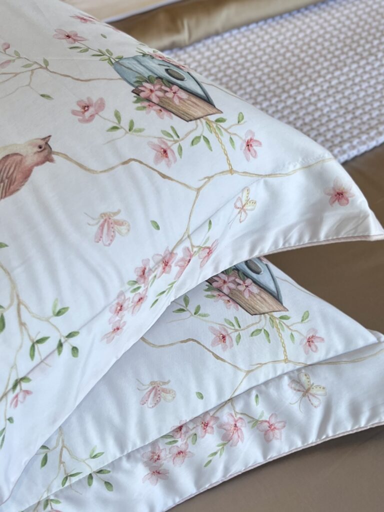 Jogo de colcha em 300 fios, 100% algodão egípcio. Em meio à delicada florada das amendoeiras, pequenos pássaros encontram abrigo e tranquilidade. Rifugio é um convite doce à imaginação, traduzindo a leveza das flores e a doçura da infância. Suas ilustrações aquareladas, em tons suaves, despertam memórias afetivas e recriam a calma dos dias despreocupados, um refúgio de ternura para momentos de aconchego.