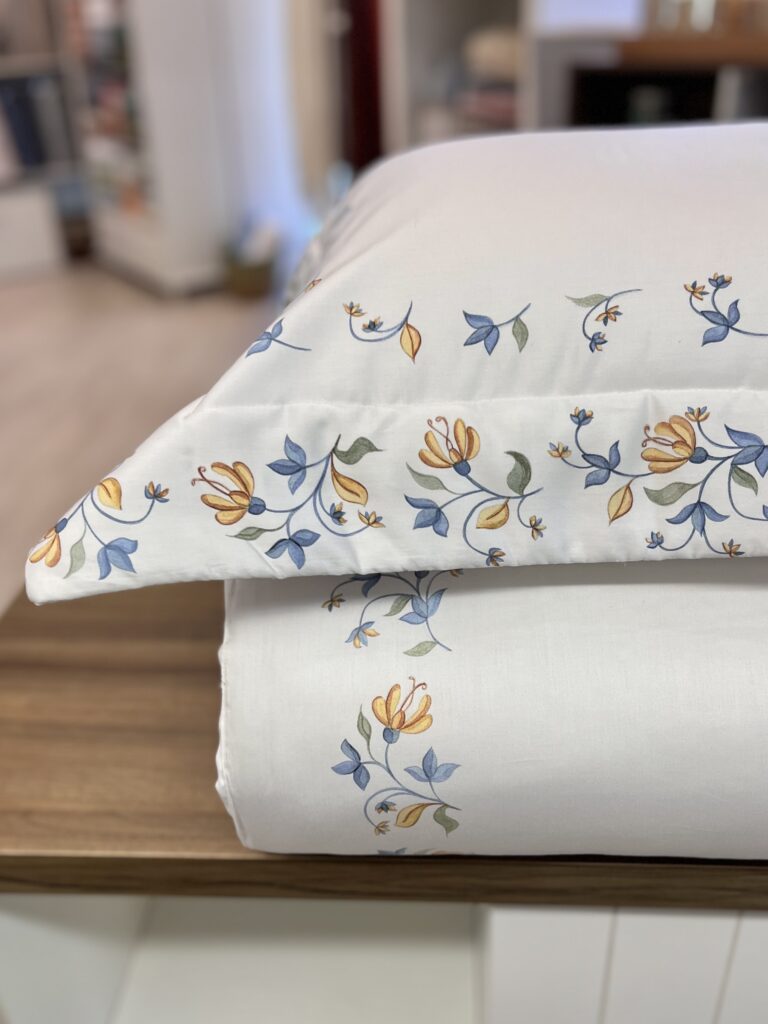 Jogo de colcha em 300 fios, 100% algodão egípcio. As cerâmicas sicilianas são conhecidas por suas vibrantes pinturas, que refletem a rica herança cultural e histórica da ilha. São adornadas com desenhos que incluem elementos naturais, figuras mitológicas, cenas do cotidiano e motivos geométricos, em cores intensas como azul, amarelo, verde e, em alguns casos, vermelho o que confere às peças um aspecto alegre e festivo. A estamparia digital de Taormina, pintada à mão em aquarela, leva não apenas o nome da cidade, mas todo o seu contexto cultural cerâmico, trazendo uma vivacidade encantadora para o dia a dia.