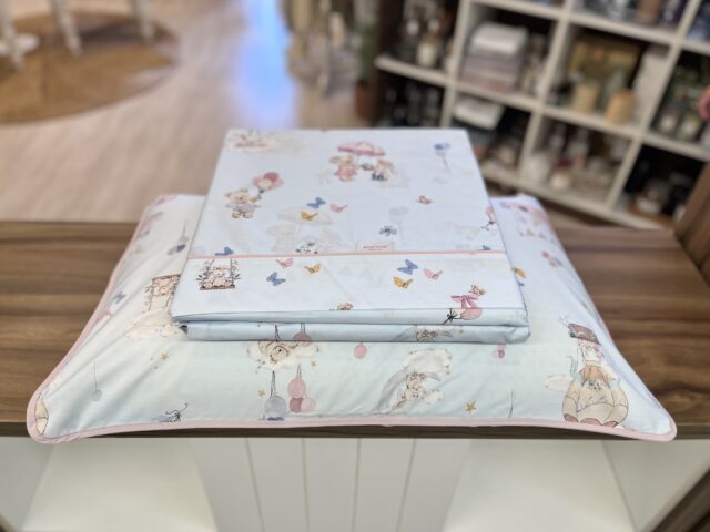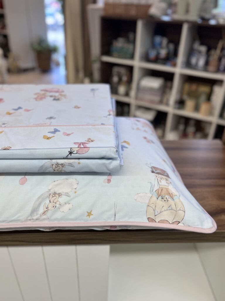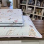 Jogo de lençol em percal, 200 fios, 100% algodão. O ursinho de pelúcia é o primeiro amigo de muitas crianças, símbolo de carinho, segurança e companhia. Inspirada nesse vínculo, Teddy traz estampa digital exclusiva, em azul suave com toques de rosa, que transformam o quarto em um refúgio de ternura. Lençol inferior estampado azul claro com elástico e lençol superior estampado azul claro, vira de dobra feita e aplique de viés rosa claro no barrado.