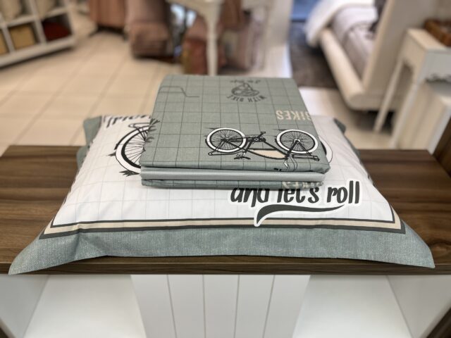 Jogo de lençol Bike em 100% algodão com 200 fios. possui acabamento antipilling, é altamente respirável, hipoalergênico e ideal para as peles mais sensíveis. Com estampa de bicicletas por todo o fundo verde, este conjunto une diversão e qualidade.