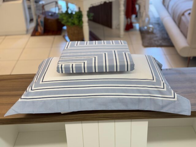 Jogo de lençol em percal 200 fios, 100% algodão, com o toque macio e aconchegante. A estampa geométrica Danton possui detalhes como a dobra feita em fundo azul com linhas brancas e pretas e o lençol com elástico com estampa geométrica de fundo branco e linhas pretas, assim como o verso das fronhas. Uma estampa charmosa e atemporal para deixar o seu quarto ainda mais bonito.
