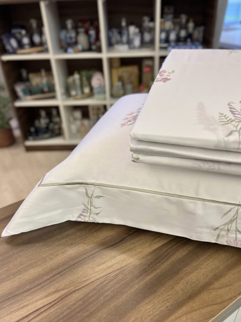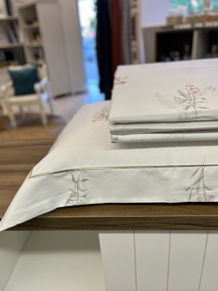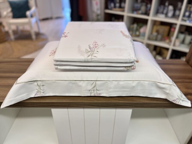 Jogo de lençol em 300 fios, 100% algodão egípcio. Com delicados buquês florais distribuídos de forma espaçada, Arabella transmite feminilidade, leveza e frescor. As fronhas recebem bordado com ponto royal, em tom de verde com leve cintilância, criando um contraste harmônico e natural. Produzido em algodão egípcio de fio tinto, garante conforto e maciez.