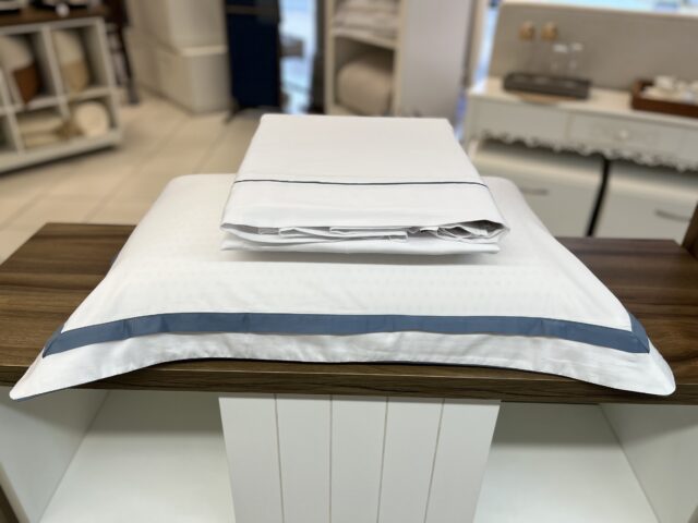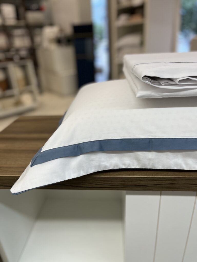 Jogo de lençol produzido em 100% algodão egípcio com 300 fios, garante uma textura extremamente macia e resistência excepcional. Seu tecido, composto por fibras longas e altamente respirável, oferece caimento impecável e é hipoalergênico, perfeito para noites de descanso pleno. O conjunto é composto por: um sobre lençol com vira de pala de 10 cm e detalhe de filete aplicado, lençol com elástico em cor sólida, e duas fronhas com 3 abas de 7 cm, acabamento com sobreposição de 2,5 cm e aplicação de cordonê em três lados. A combinação de branco e azul adiciona um toque de sofisticação moderna, harmonizando perfeitamente com o edredom e o jogo de colcha da mesma coleção.