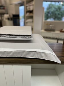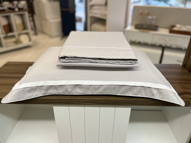 Jogo de lençol produzido em 100% algodão egípcio com 300 fios, garante uma textura extremamente macia e resistência excepcional. Seu tecido, composto por fibras longas e altamente respirável, oferece caimento impecável e é hipoalergênico, perfeito para noites de descanso pleno. O conjunto é composto por: um sobre lençol com vira de pala de 10 cm e detalhe de filete aplicado, lençol com elástico em cor sólida, e duas fronhas com 3 abas de 7 cm, acabamento com sobreposição de 2,5 cm e aplicação de cordonê em três lados. A combinação de branco e azul adiciona um toque de sofisticação moderna, harmonizando perfeitamente com o edredom e o jogo de colcha da mesma coleção.