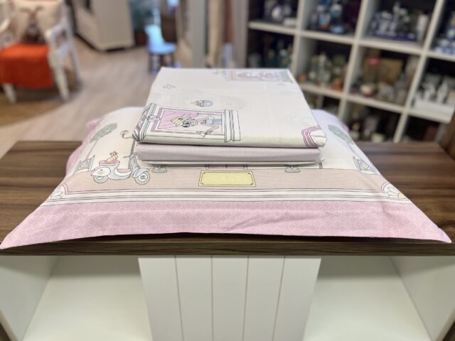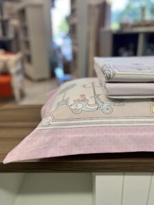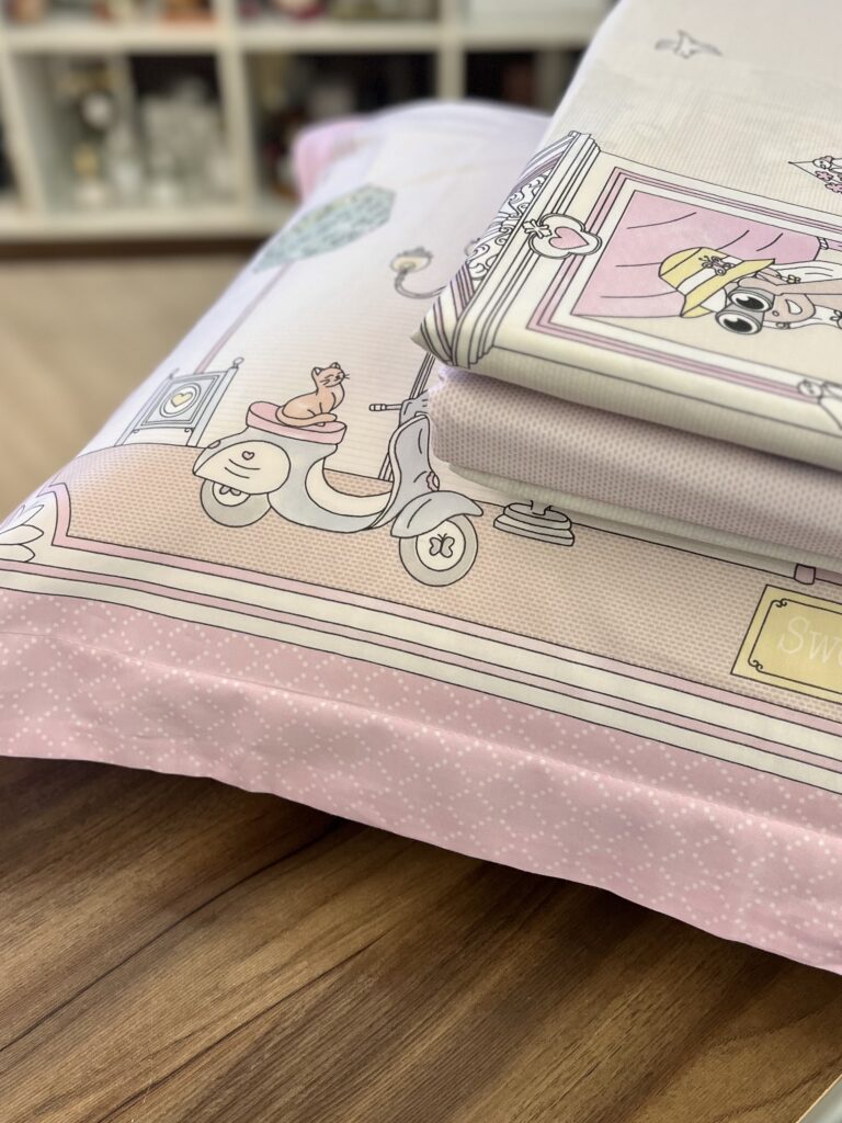 Jogo de lençol em percal 200 fios, 100% algodão. Flory transforma o quarto em um espaço lúdico, onde a imaginação transborda. Sua estampa em tons de rosa traz um cenário encantador, inspirado em uma casa de bonecas. A fronha recebe uma estampa dimensionada que emoldura a fachada da casa, enquanto o sobre lençol traz uma brincadeira com as personagens na janela e diversos elementos. Com um toque sutil, o lençol com elástico completa a composição com uma estampa auxiliar em um tracejado coordenado. Um jogo de cama que encanta, diverte e preenche o ambiente.