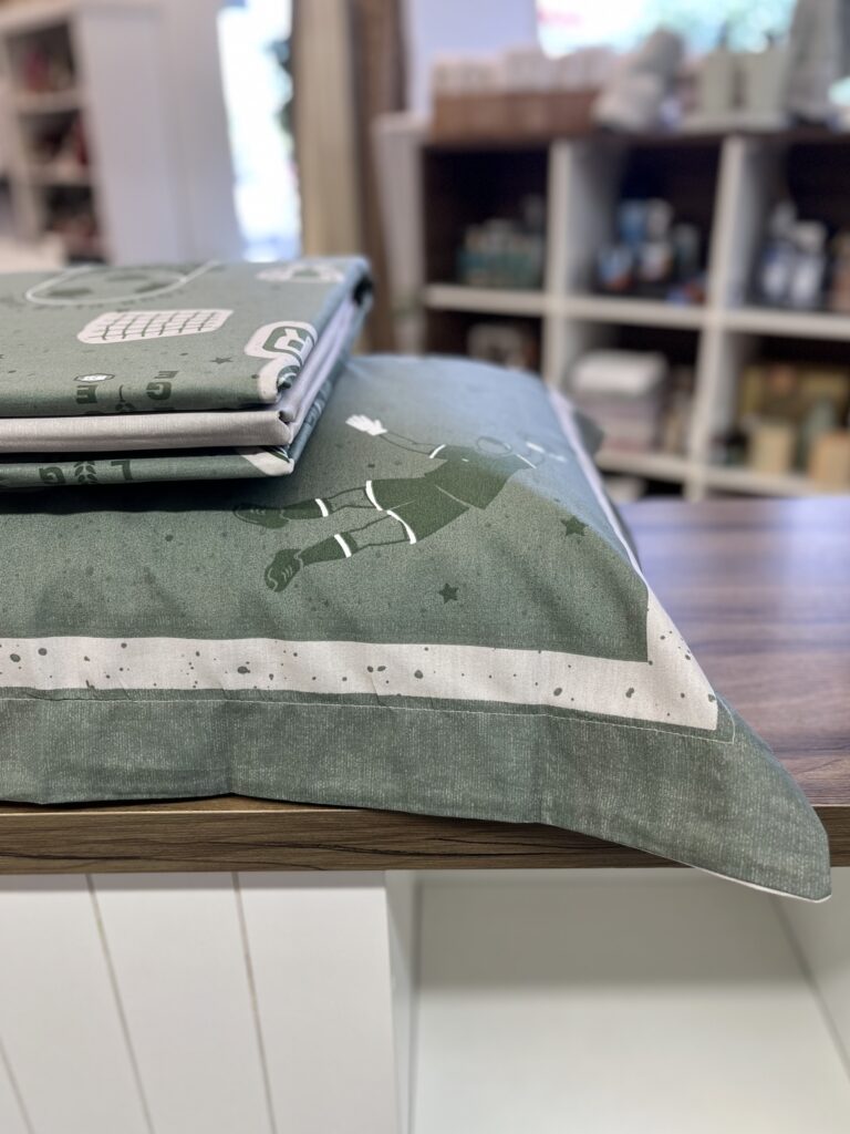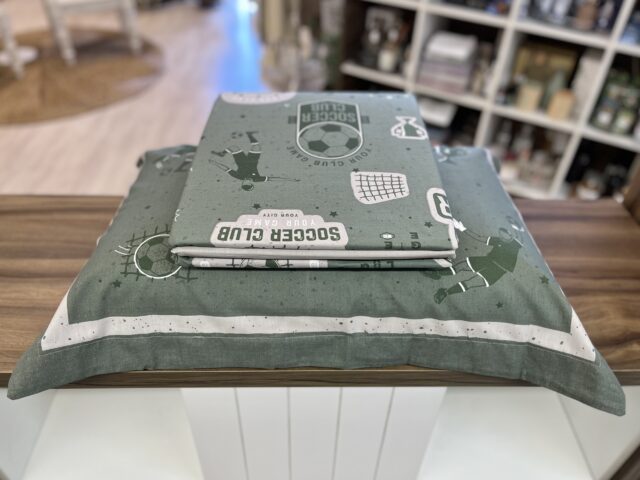 Jogo de lençol em percal 200 fios, 100% algodão. Futebol traz o espírito esportivo para o quarto com um design moderno e divertido. Com estampa em tons de verde e elementos inspirados no universo do futebol, ele cria um ambiente cheio de energia, perfeito para quem ama o esporte. O sobre lençol possui dobra feita e acabamento impecável, enquanto as fronhas, com abas, completam o conjunto com um toque de cuidado nos detalhes. A estampa do lençol com elástico mantém a harmonia do visual, deixando a cama sempre arrumada e convidativa.