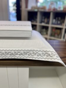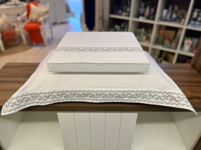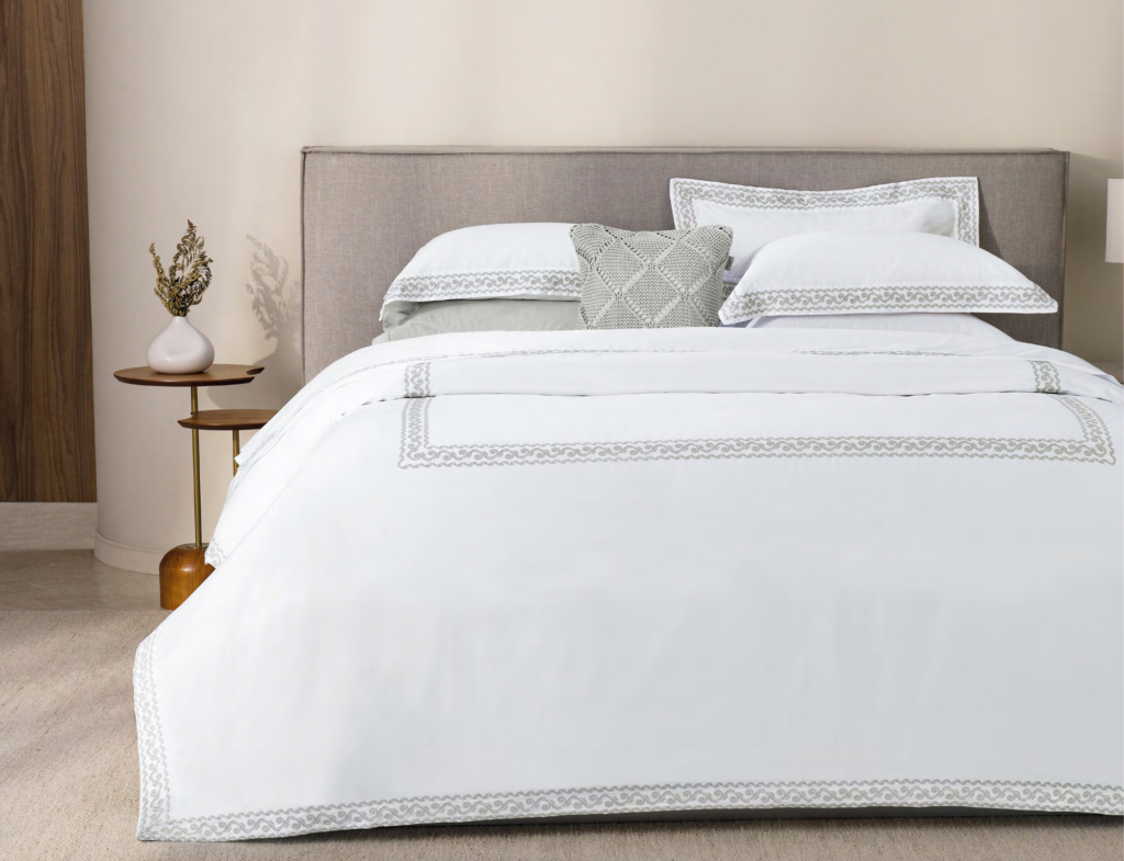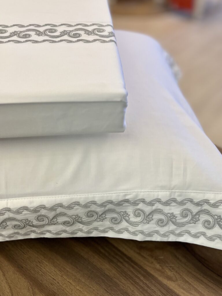 Jogo de lençol em cetim 300 fios, 100% Algodão Egípcio. Combina qualidade, conforto e acabamento sofisticado em uma proposta atemporal. Seu bordado é inspirado nos afrescos romanos e na imponência das colunas que marcaram a arquitetura imperial, traduzindo elementos clássicos com refinamento. Apresenta toque sedoso e maciez excepcional.
