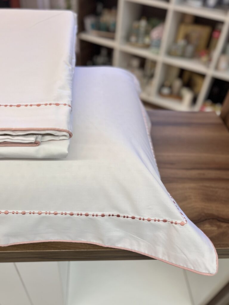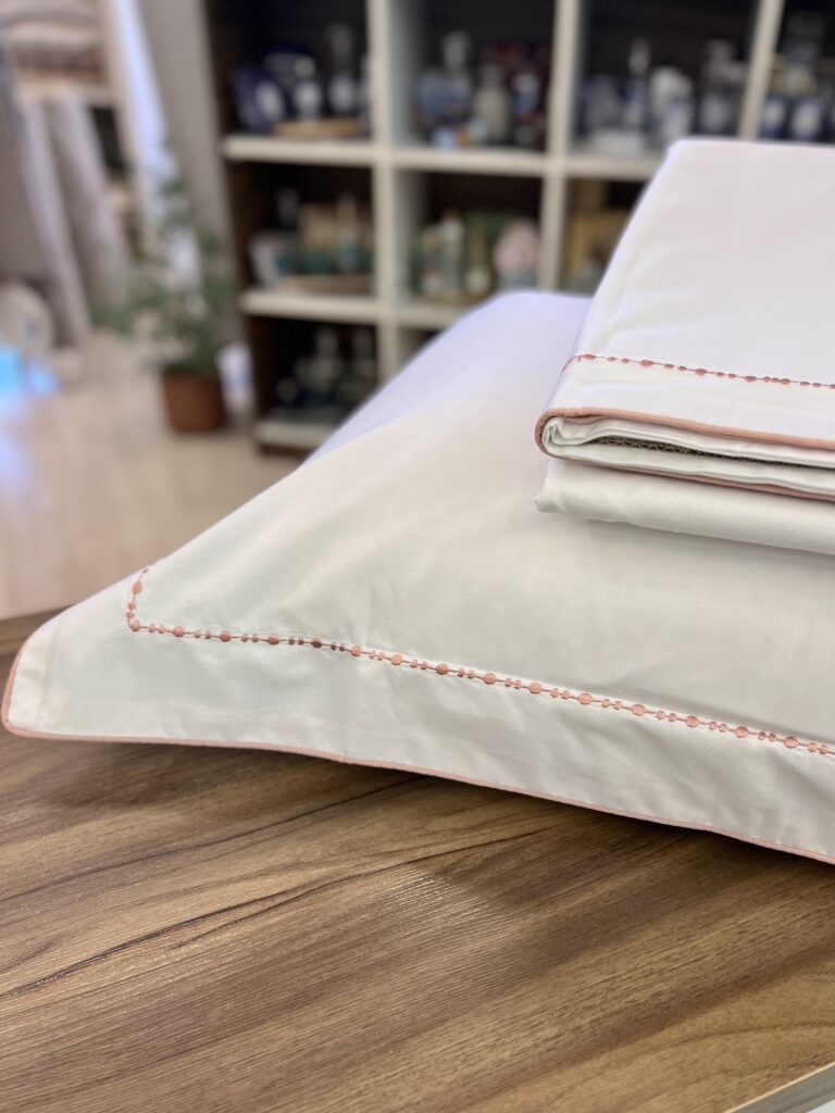 Jogo de lençol em percal 200 fios, 100% algodão. Delicado e minimalista, Lina traz pequenos elementos geométricos bordados, que emolduram as fronhas e sobre lençol em uma composição sutil. Além disso, a fronha conta com três abas, filetadas com cordonê da mesma cor do bordado. É discreta e, ainda assim, tem detalhes e acabamentos que trazem muito charme para o quarto.