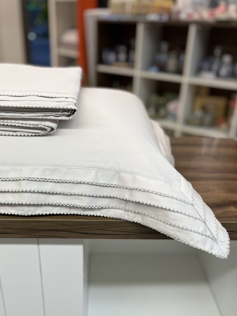 Jogo de lençol em cetim 400 fios, 100% algodão, com toque extremante macio e aconchegante. Um clássico da alfaiataria com sofisticado acabamento em pregas na vira do sobrelençol e fronhas. Tecido nobre, com corte e caimento impecável e toque acetinado.