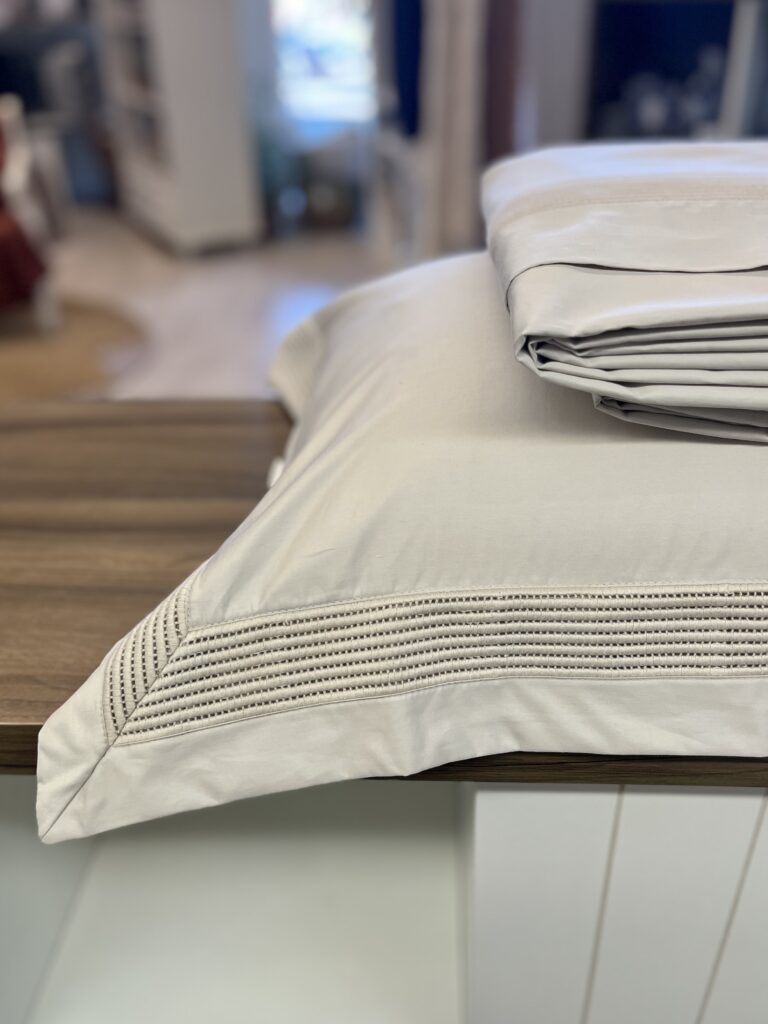 Jogo de lençol em cetim 600 fios, 100% algodão. Ecoando o charme inconfundível de Paris, traduz a essência do estilo. Revela-se em um tecido acetinado de toque envolvente e acabamento primoroso, que reflete o mais alto padrão da Buddemeyer em roupa de cama de luxo. O destaque vai para o guipure geométrico em algodão, com padrão retangular exclusivo, que remete às linhas elegantes das ruas parisienses. Aplicado com precisão na dobra do sobrelençol e nas fronhas, o esplendoroso guipure é harmoniosamente combinado a aba lisa, criando uma composição contemporânea, capaz de elevar tanto propostas minimalistas quanto ambientes mais clássicos com seu design.