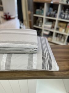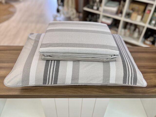 Jogo de lençol em malha, 100% algodão, com toque muito macio e aconchegante. Miragem combina listras em tons de cinza e preto sobre fundo claro, criando um visual moderno e sofisticado para o quarto.