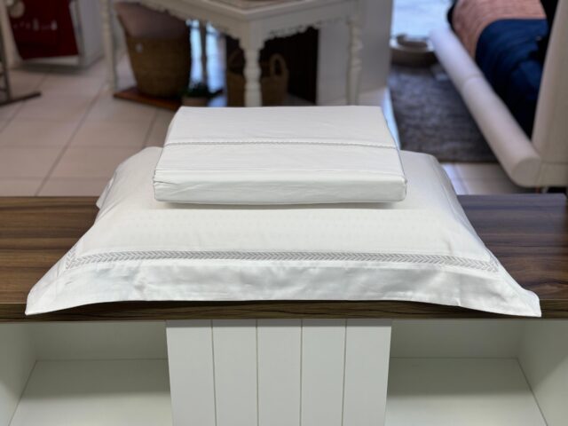 Jogo de lençol em cetim 600 fios, 100% algodão egípcio, com o toque extremamente macio e aconchegante. Montale é a personificação da elegância romântica com um design atemporal. Inspirado na paisagem pitoresca de Cinque Terre, onde folhas balançam suavemente ao vento à beira-mar, este conjunto traduz essa serenidade em detalhes sutis e sofisticados. A dobra do sobrelençol e as fronhas com 3 abas são adornadas com entremeio bordado, aplicado manualmente, que confere um toque artesanal e refinado.