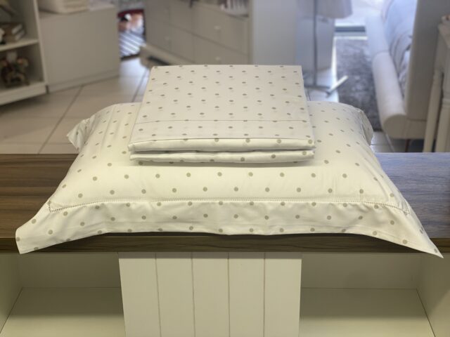 Jogo de lençol em cetim 300 Fios, 100% Algodão, com toque macio e aconchegante. Possui estampa poá, acabamento em ponto ajour na fronha e na vira do lençol e é um clássico que não sai de moda. É possível combinar com outras peças lisas e estampadas.
