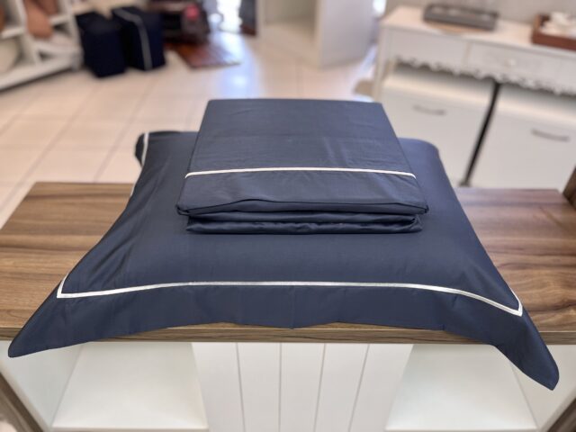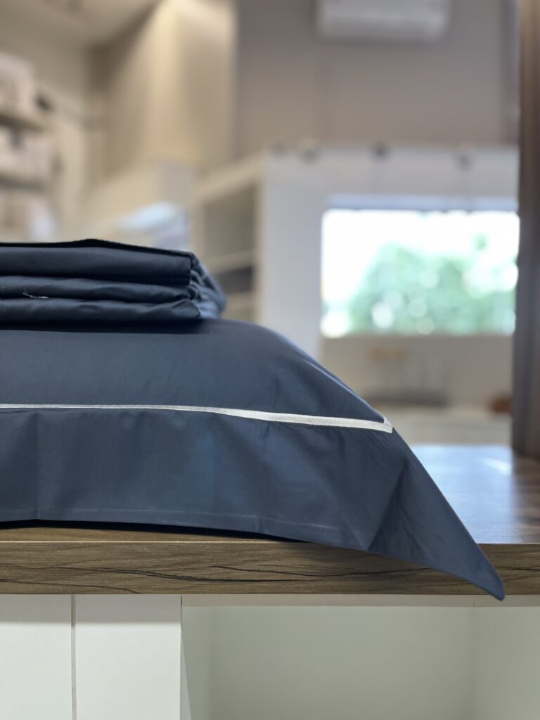 Jogo de lençol em 500 fios, 100% algodão egípcio. O impecável ponto cheio, em cor contrastante, emoldura fronhas e a dobra feita do sobrelençol, conferindo acabamento ainda mais refinado às peças. Perfeito para compor os ambientes com requinte