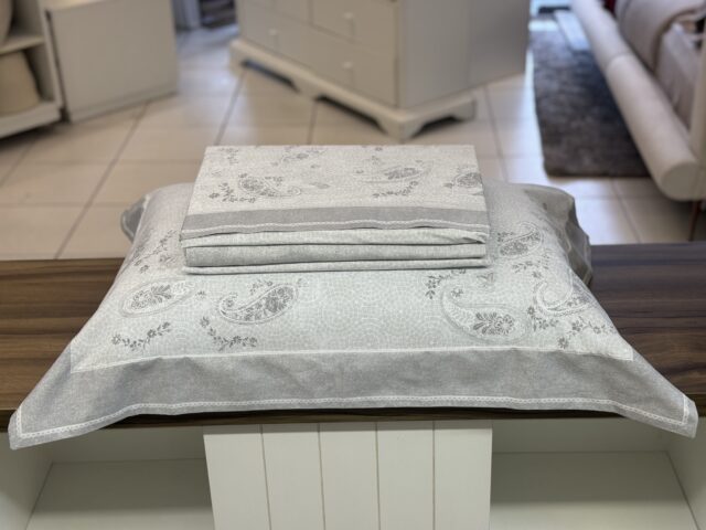 Jogo de lençol em percal 180 fios, 100% Algodão fio penteado, com toque macio e aconchegante. Descubra o refinamento e a elegância da estampa Mahara, que se destaca por sua moderna interpretação da padronagem paisley tradicional, apresentando um trabalho artístico requintado em tons de cinza e prata, enriquecido por um efeito 3D, que dá vida a peças autênticas e cheias de personalidade.