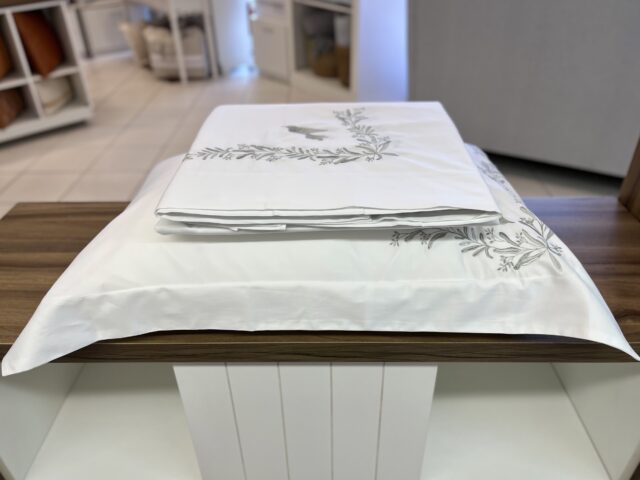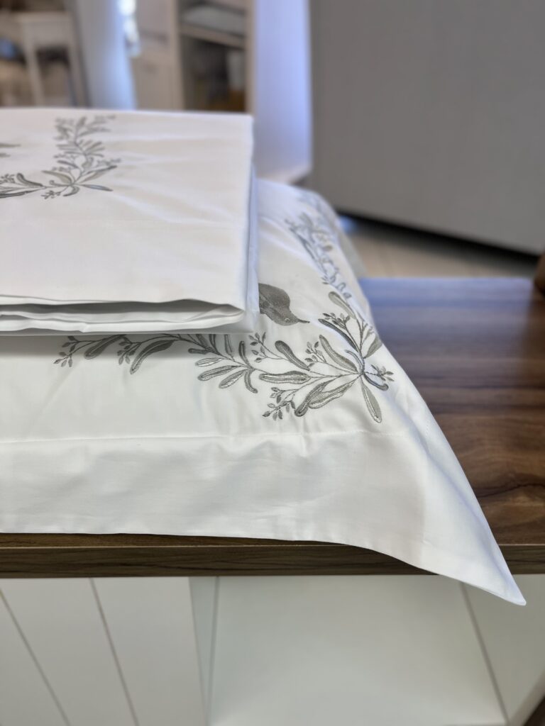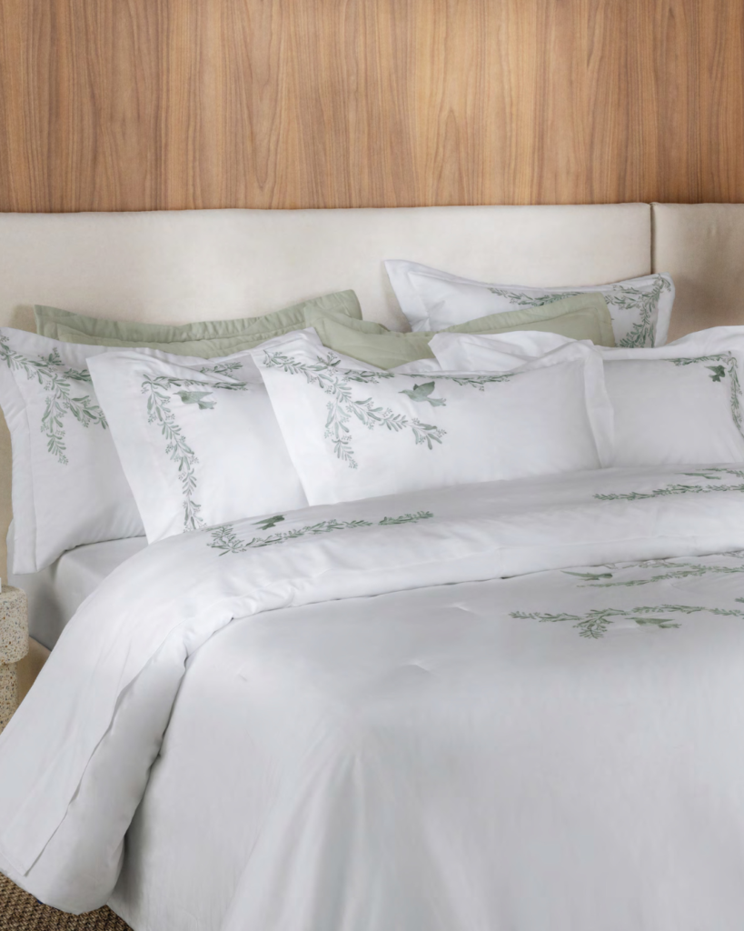 Jogo de lençol em 300 fios, 100% algodão egípcio. O bordado deste jogo de cama é inspirado no cultivo do pistache da cidade de Bronte. Localizada nas encostas do Monte Etna, a região possui um solo vulcânico rico, que proporciona condições ideais para o crescimento desse pistache de qualidade ímpar. Sua cor singular, sabor inigualável e aroma marcante o tornam um produto altamente desejado. Ao trazer essa inspira- ção para o bordado, a cama não apenas se torna um elemento decorativo, mas também uma forma de transmitir frescor e romantismo. A combinação de elegância e personalidade que este bordado oferece transforma qualquer ambiente em um refúgio acolhedor, onde a rotina ganha um toque especial e sofisticado.