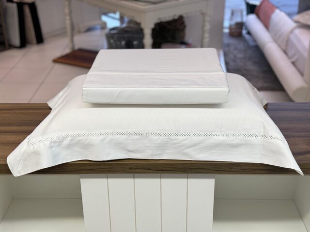 Jogo de lençol em cetim 300 fios, 100% algodão, com o toque extremamente macio e aconchegante. Uma excelente escolha para quem aprecia um estilo sofisticado e elegante. O lençol possui detalhe bordado em ponto ajour nas abas da fronha e na vira do lençol.