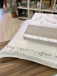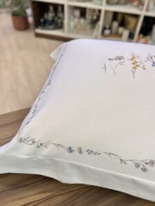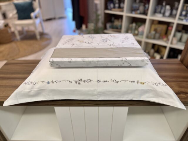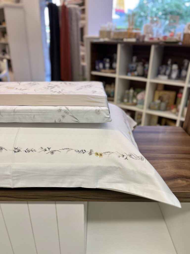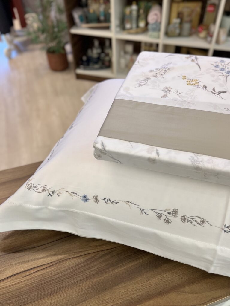 Jogo de lençol em 300 fios, 100% algodão. Sua estampa sofisticada de flores minimalistas traz um toque de modernidade e aconchego à decoração do ambiente.