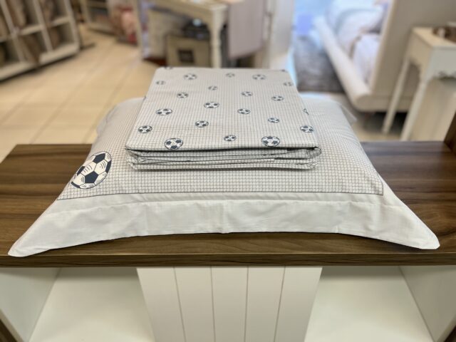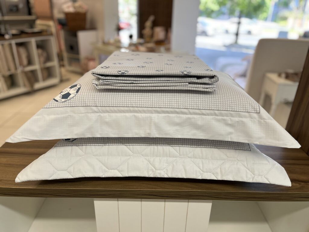 Jogo de Lençol em percal de algodão egípcio 200 fios. A estampa Football é perfeita para os amantes do futebol que querem levar essa paixão para a decoração. Seu toque macio proporciona uma experiência de descanso incrível, sem abrir mão do estilo.