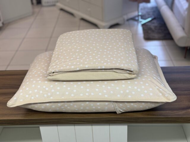 Jogo de lençol em malha, 100% Algodão, com toque muito macio e aconchegante. Sua estampa poá e seu acabamento em viés cria um composê elegante para a cama.
