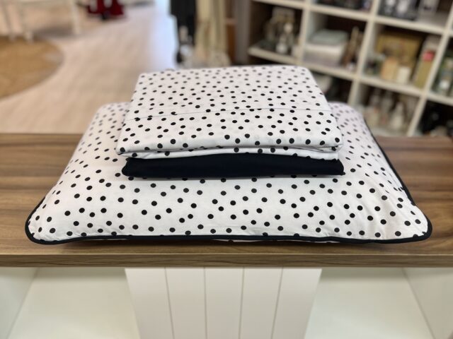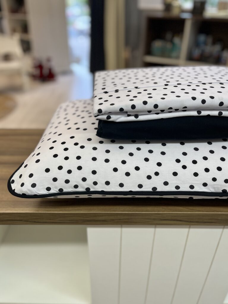 Jogo de lençol em malha, 100% algodão, com toque muito macio e aconchegante. Sua estampa poá e seu acabamento em viés cria um composê elegante para a cama.
