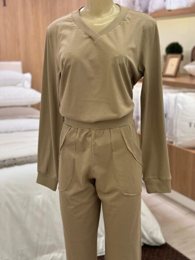 Pijama feminino em algodão, com toque macio, quentinho e confortável, estilo moletinho. Blusa de manga longa com decote em V e calça comprida com bolsos.