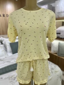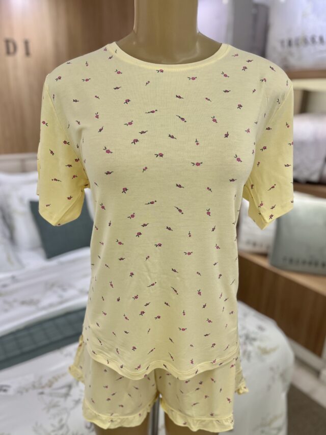 Pijama feminino em viscose, com toque fresco e aconchegante. A estampa exclusiva traz um design único, enquanto o falso amarrador no shorts adiciona um detalhe moderno. O babado na barra do shorts traz um toque delicado e feminino, tornando este conjunto perfeito para quem busca conforto com estilo.