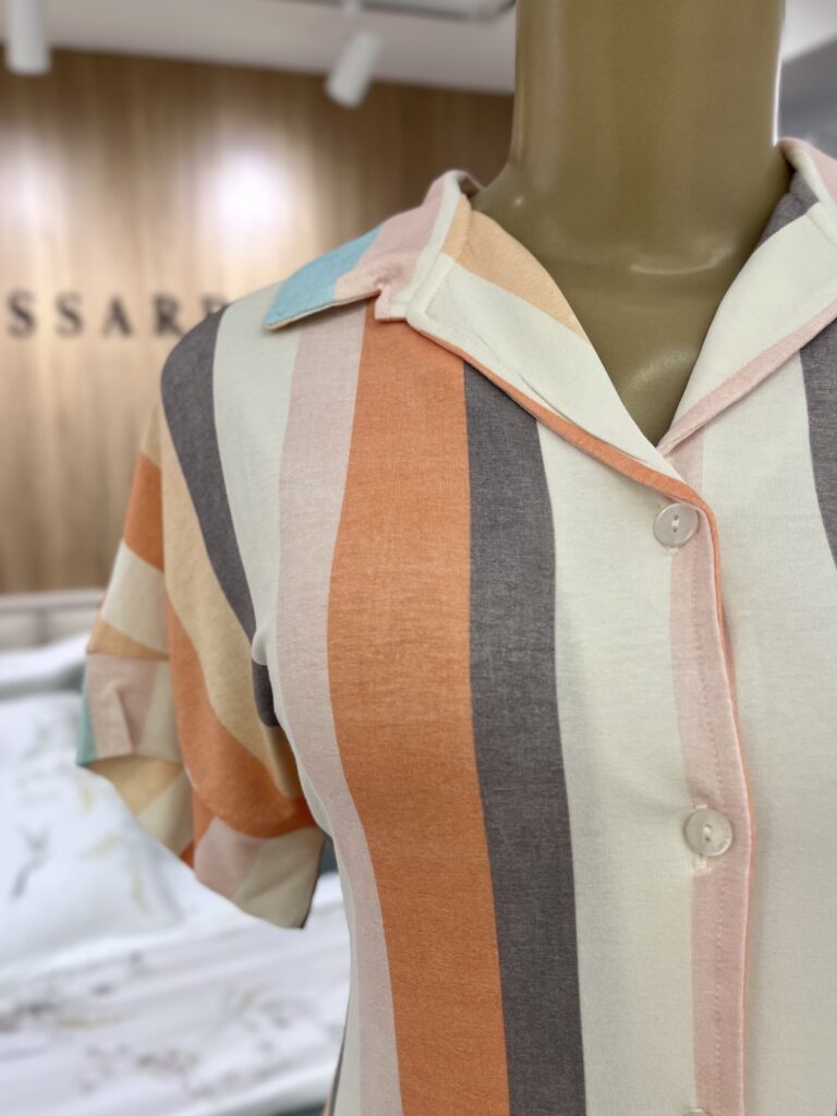 Pijama feminino em viscose, com toque muito macio e fresquinho. Possui modelagem ampla e listras vibrantes, é ideal para quem busca conforto. É curto, leve, tem manga curta e decote arredondado.