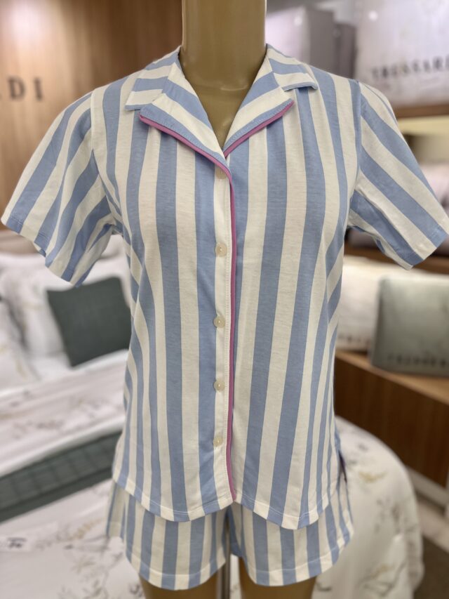 Pijama feminino em malha comfort, 100% algodão. Combinando charme clássico e conforto absoluto, este pijama americano é macio ao toque e leve para as noites de descanso. Possui fundo off white com estampa rotativa de listras verticais na cor azul, criando um visual clean e sofisticado. A blusa apresenta modelagem tradicional com mangas curtas, abertura frontal com seis botões off white e fendas laterais, que garantem mais liberdade de movimento. O diferencial está nos acabamentos em filete rosa claro ao longo da abertura e nas fendas laterais, trazendo um toque feminino e delicado à peça. O shorts acompanha o visual listrado, compondo um conjunto harmônico e cheio de personalidade, ideal para quem valoriza conforto com estilo nos momentos de relax.