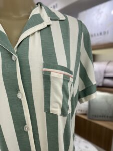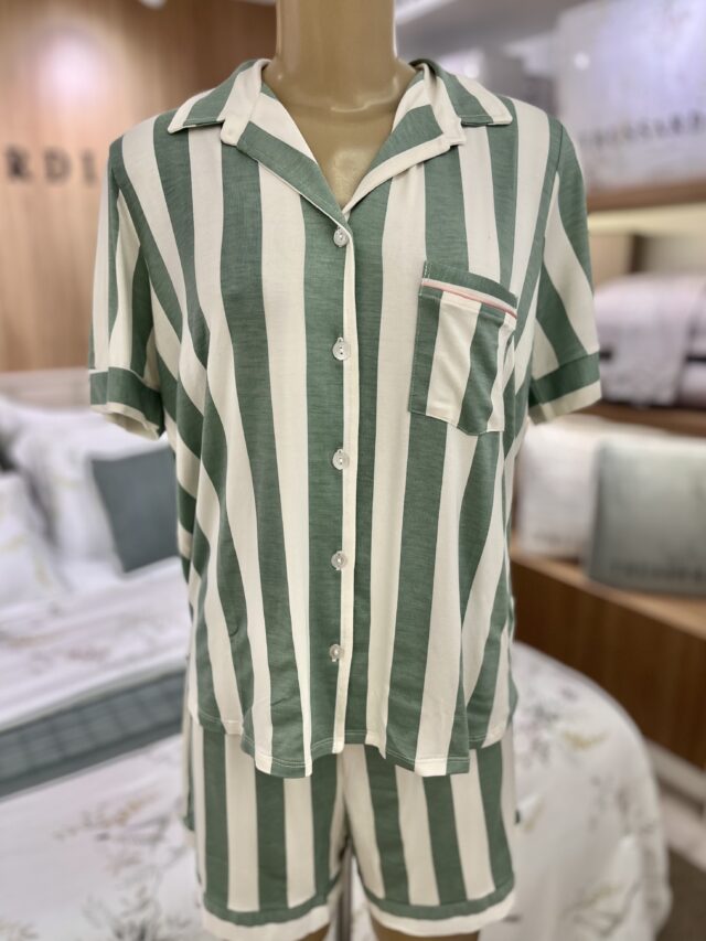 Pijama feminino em viscose com toque macio e fresquinho. Une conforto e estilo para o dia a dia em casa. O conjunto conta com blusa de botão com mangas curtas, bolso no busto, gola esporte e listras. O shorts é listrado e possui caimento leve, garantindo liberdade de movimento e toque agradável na pele.