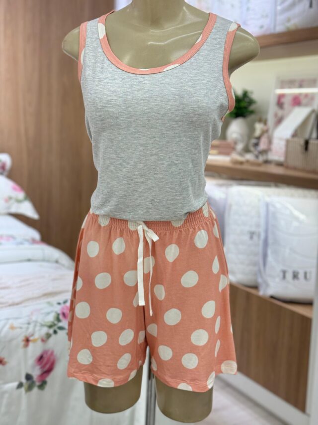 Pijama feminino em viscose, com toque muito suave, fresquinho e aveludado. Adicione elegância e conforto ao seu descanso, confeccionado em tecido Sublime Touch, material respirável, mantendo você fresco e confortável durante toda a noite. Desfrute de um padrão encantador de etampa poá em tons suaves de rosa e cinza, que trazem uma sensação de tranquilidade e encantamento ao seu momento de relaxamento. Regata cavada com acabamento na estampa poá e short com elástico na cintura, garantindo um ajuste perfeito e liberdade de movimento.
