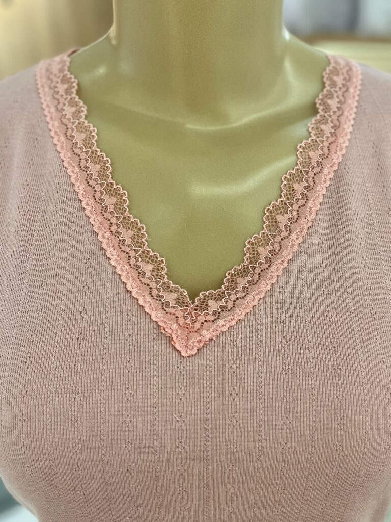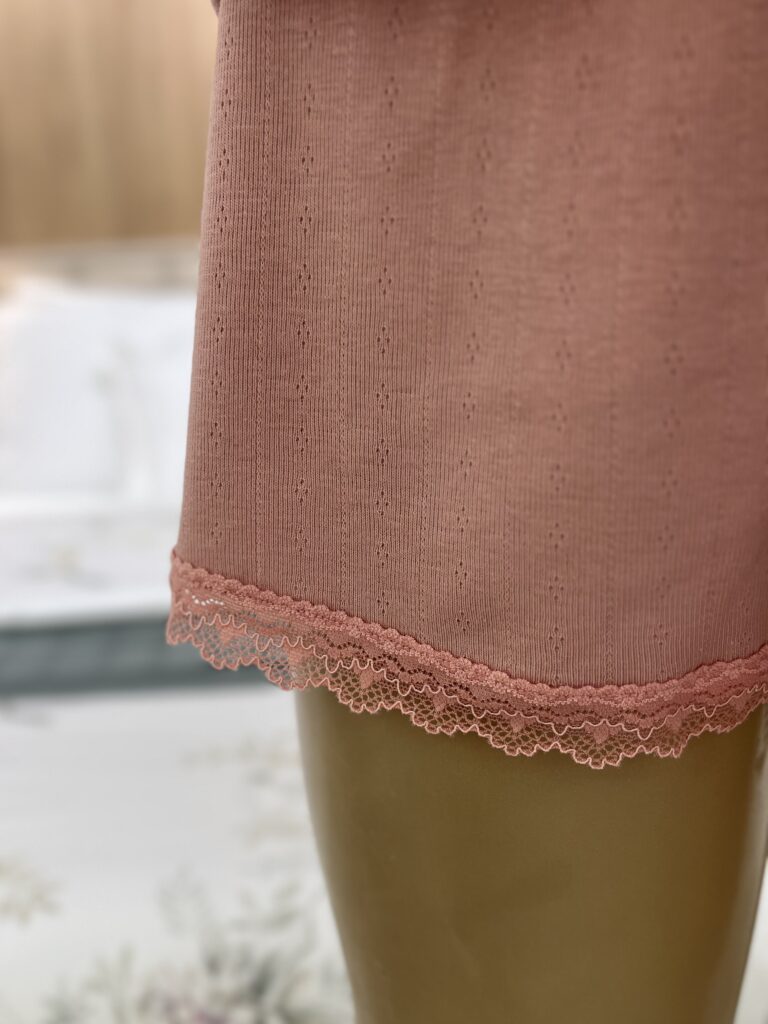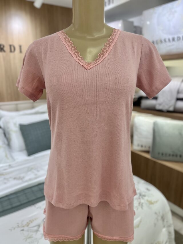 Pijama feminino verão em 50% algodão e 50% poliéster. O conjunto, em jacquard de algodão, tem blusa de mangas curtas, decote em ‘V’, e detalhe em renda no decote. O shorts é soltinho e possui detalhe em renda na barra.