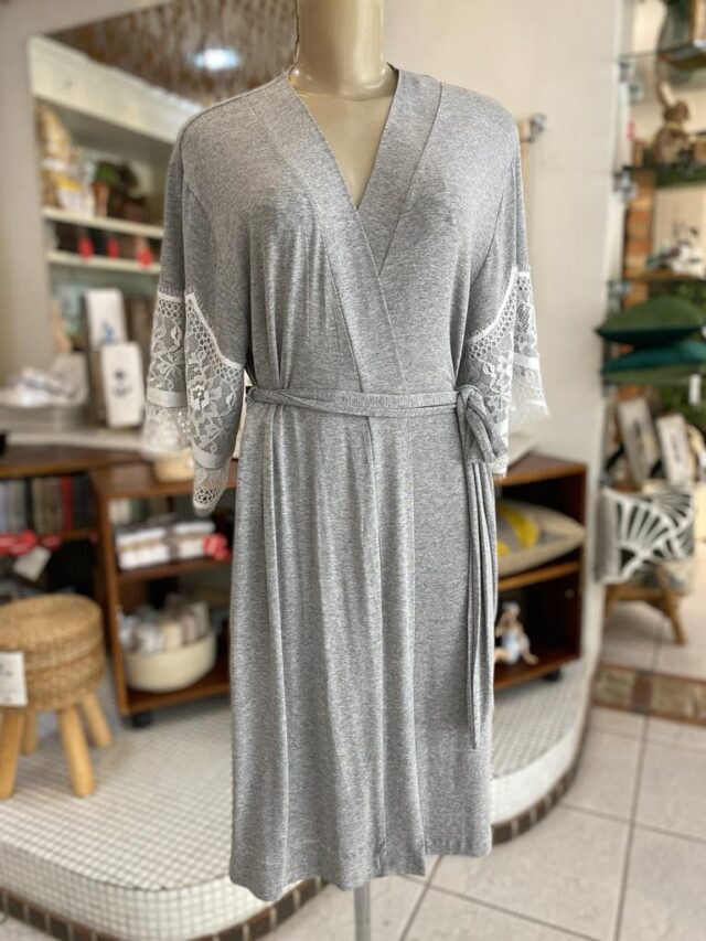 Robe feminino todo em viscose com lindo detalhe em renda nas mangas. Possui mangas curtas, comprimento midi e cinto para amarração. Muito leve, macio e aconchegante.