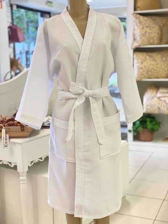 Robe hotelaria em piquet com mangas compridas e comprimento midi. Possui dois bolsos frontais e cinto para amarração na cintura.