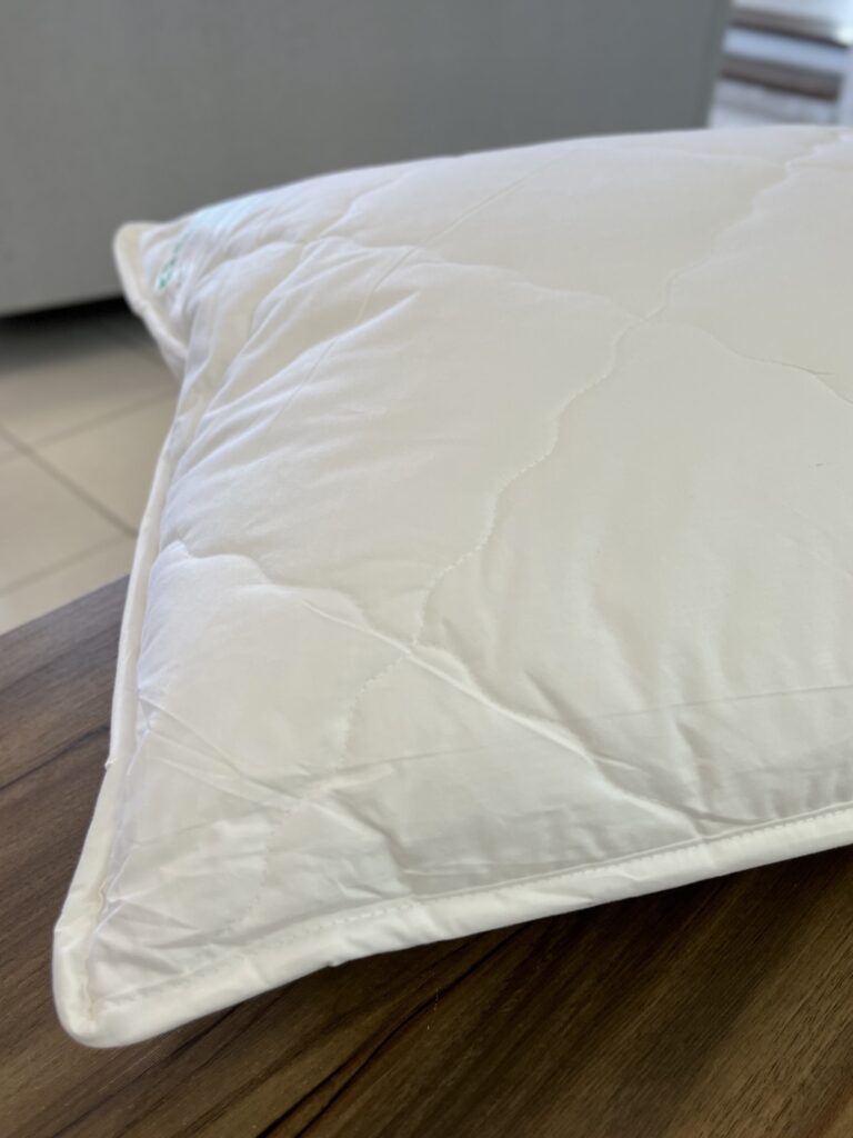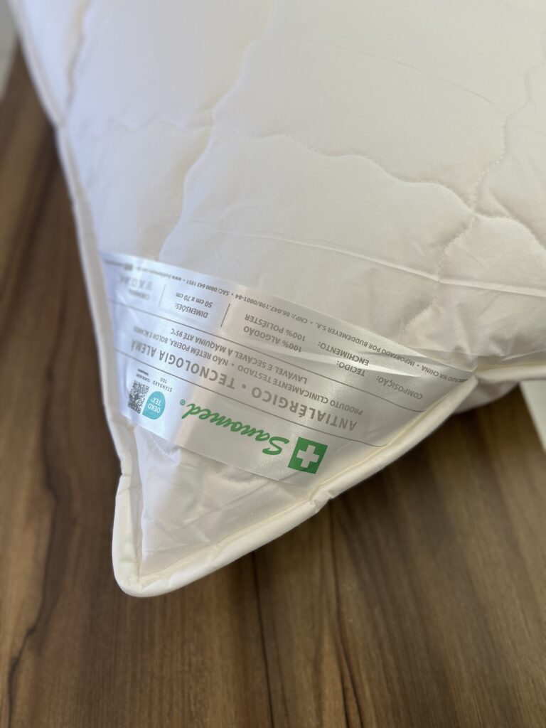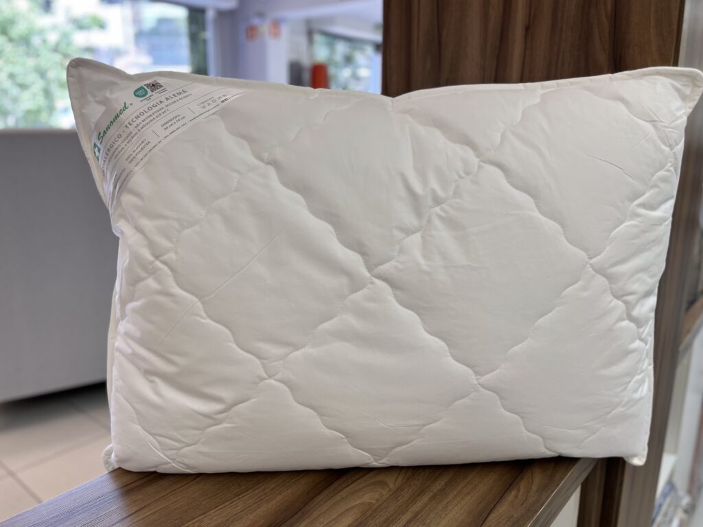 Travesseiro com tecnologia alemã. Em tecido cetim 100% algodão e enchimento 100% poliéster. Tecido fechado que impossibilita a entrada de ácaros e a formação de bolor. Enchimento flocado e em forma de esfera e quando entram em atrito matam toda a bactéria. Tecnologicamente e clinicamente testado e aprovado. Não retém poeira, bolor e ácaros.